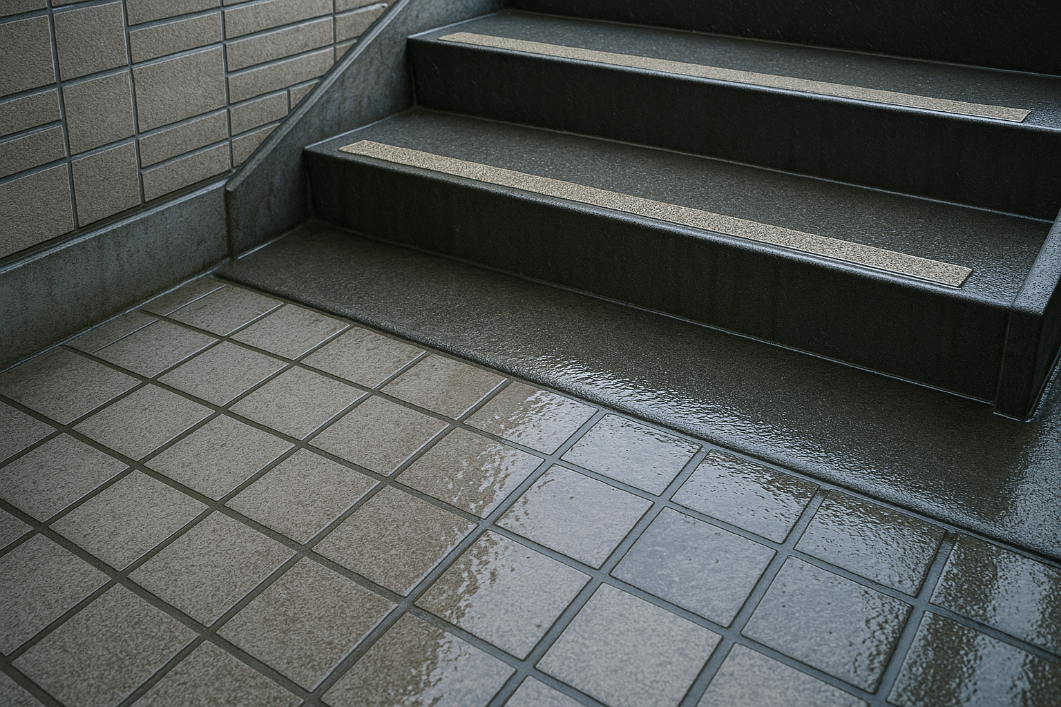 雨の日に滑りやすくなるタイルやコンクリートは、