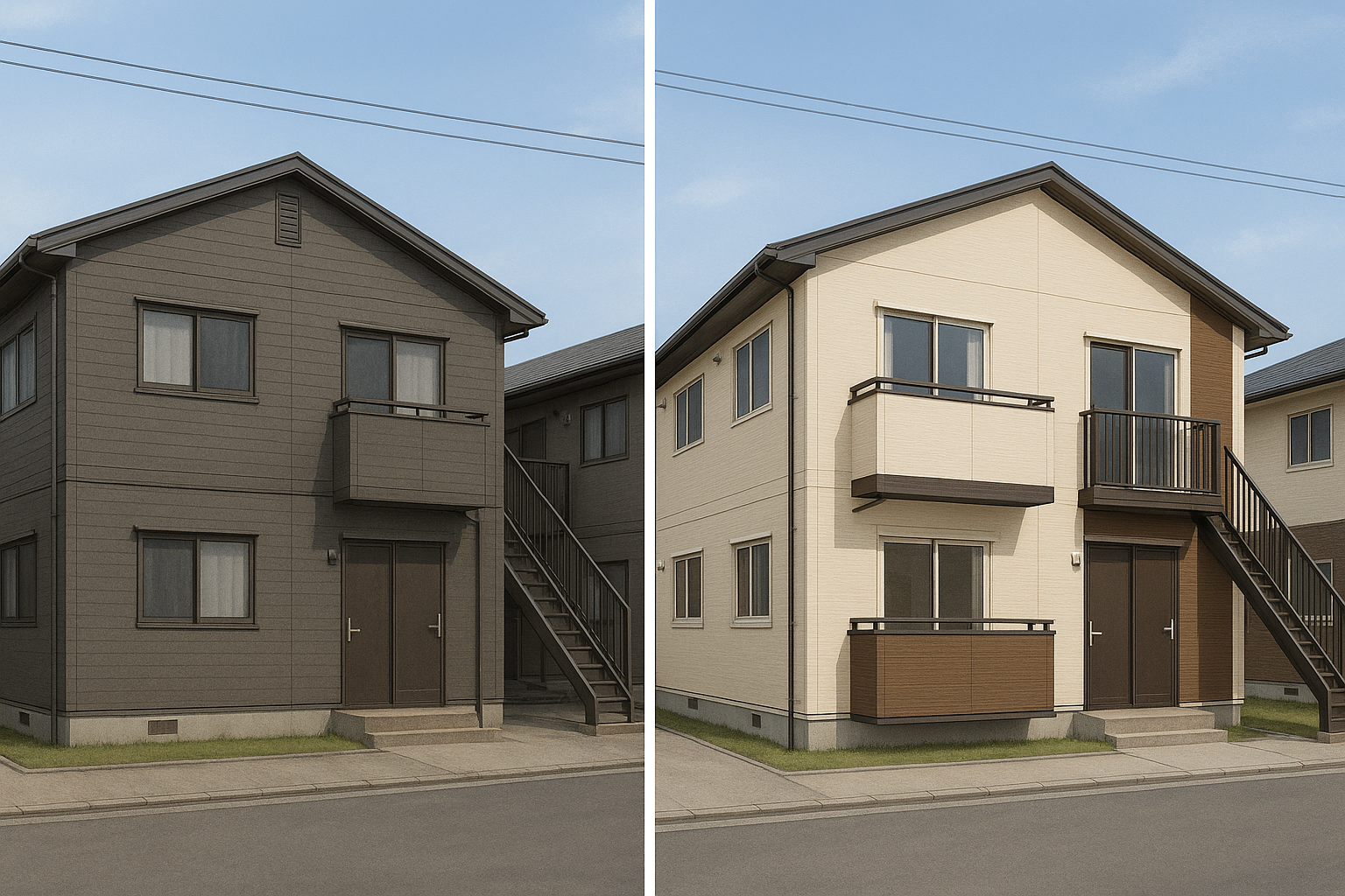既存の外壁に異なるカラーを塗装する方法。コストを抑えつつ印象を変えられるため、最も一般的です。