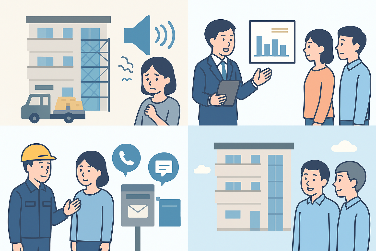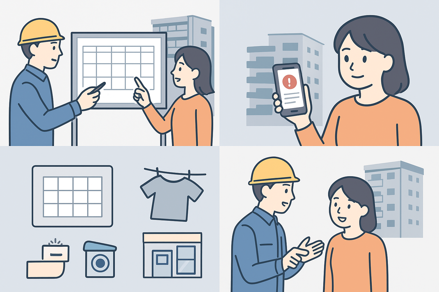 事前説明に「期間」「作業時間」「騒音の有無」「洗濯物の制限」「共用部の通行規制」を必ず含めます。